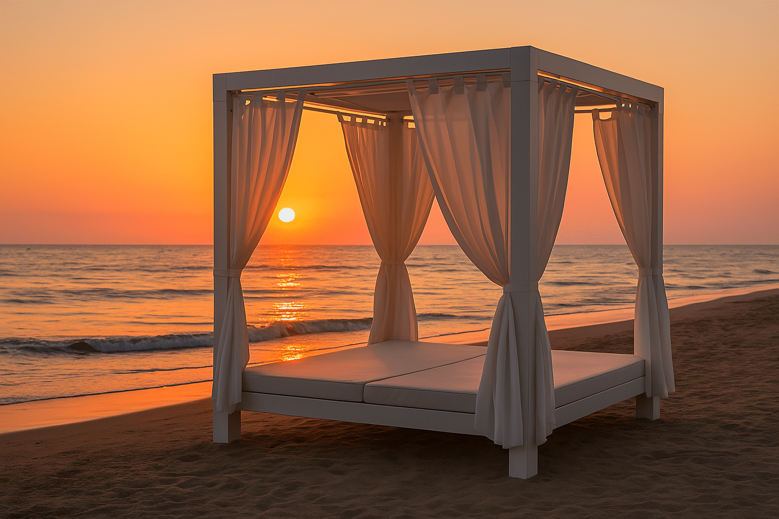 The Joy (fixed) and Dream (reclining) Daybeds are high-end canvas loungers, designed for Ho.Re.Ca. environments such as hotels, resorts, spas, and beach clubs. Made of white powder-coated aluminum, the structure is weather- and salt-resistant, featuring AISI 316 stainless steel hardware and reinforced corner joints for exceptional durability. Its Made in Italy design combines elegance, functionality, and superior build quality, ideal for intensive professional use.