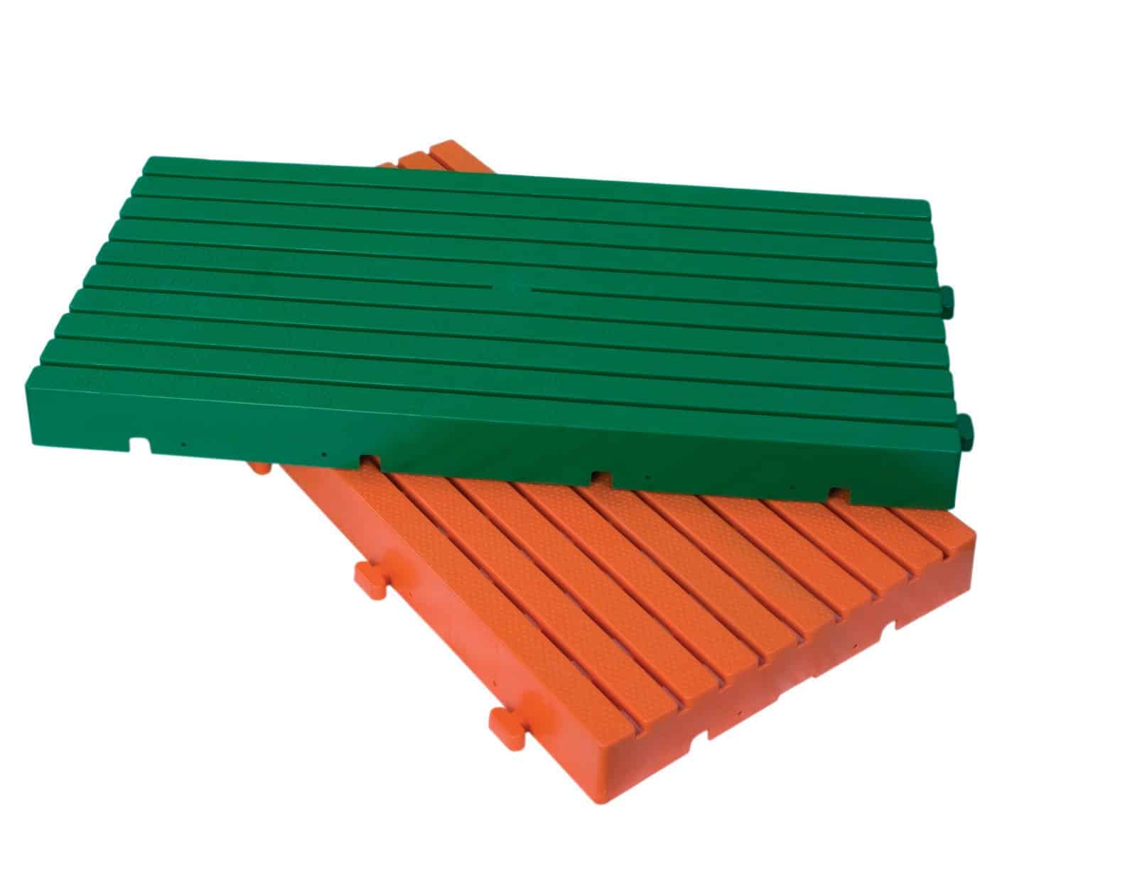 Las plataformas de plástico están fabricadas en polietileno antideslizante, estabilizado a los rayos UV. Todos los bloques cuentan con ganchos, tanto en el lado largo como en el corto, para formar pasarelas de la medida deseada.