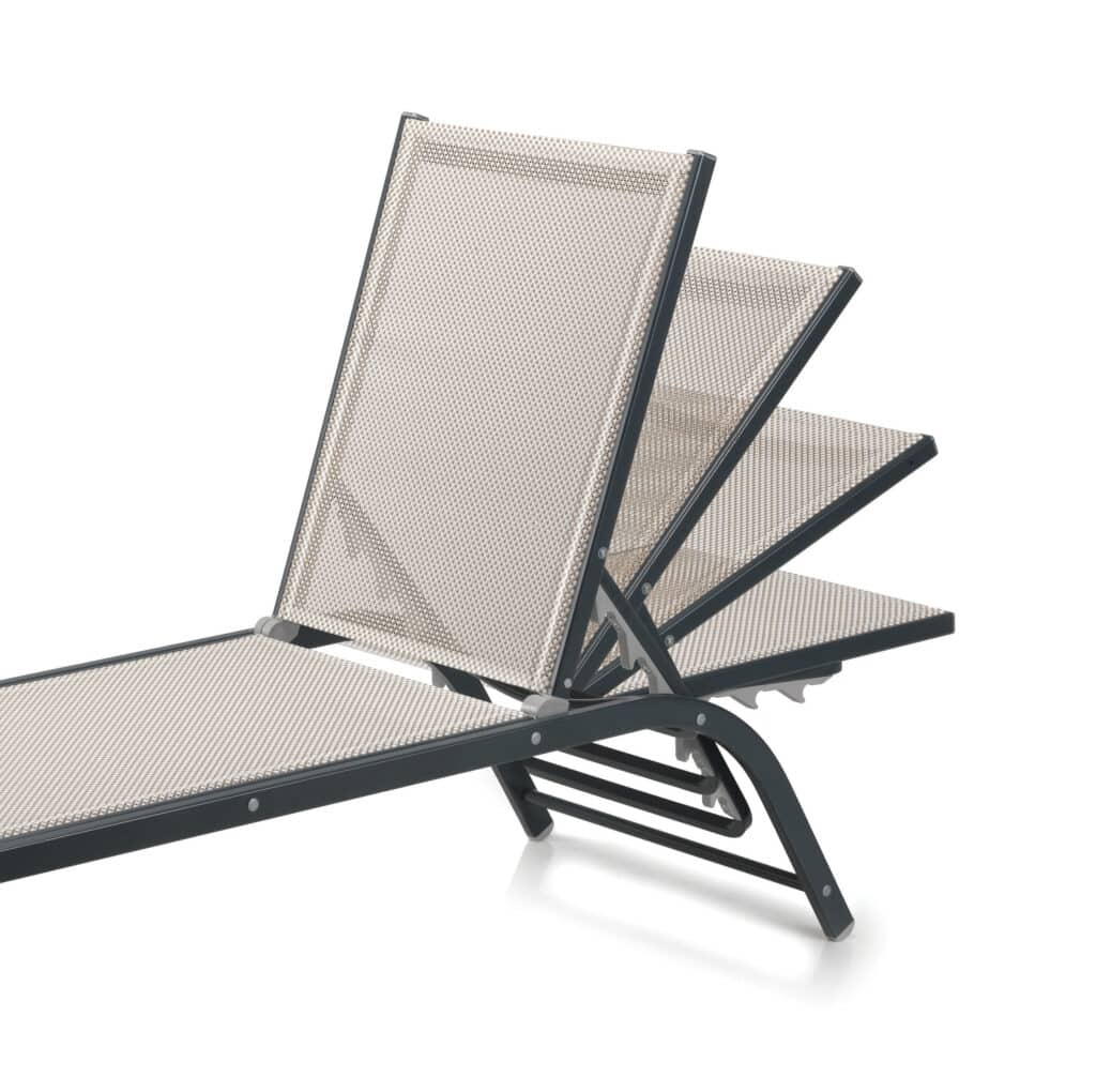 Le dossier inclinable en 4 positions est équipé d’un système à échelle, qui permet de régler facilement l’inclinaison pour garantir un maximum de détente. La quincaillerie en acier inoxydable AISI 316 assure une longue durée de vie même dans les environnements marins ou à forte humidité.